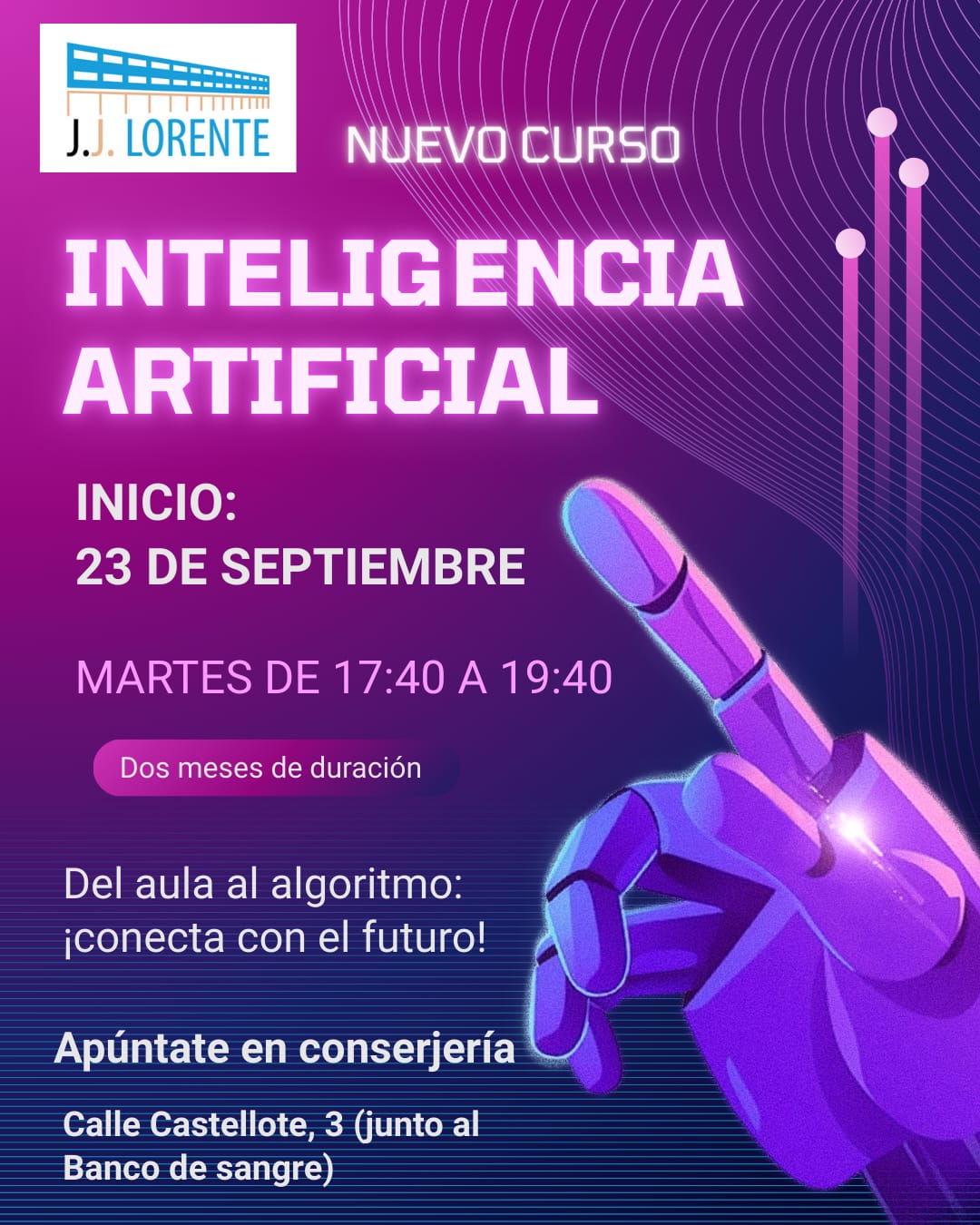 CURSO DE INTELIGENCIA ARTIFICIALPor secretariajjlorente / 8 septiembre, 2025 Nuevo curso de IA en el Juan José Lorente. Los martes de 17:40 a 19:40, de septiembre a noviembre. Inscripciones en conserjería.
